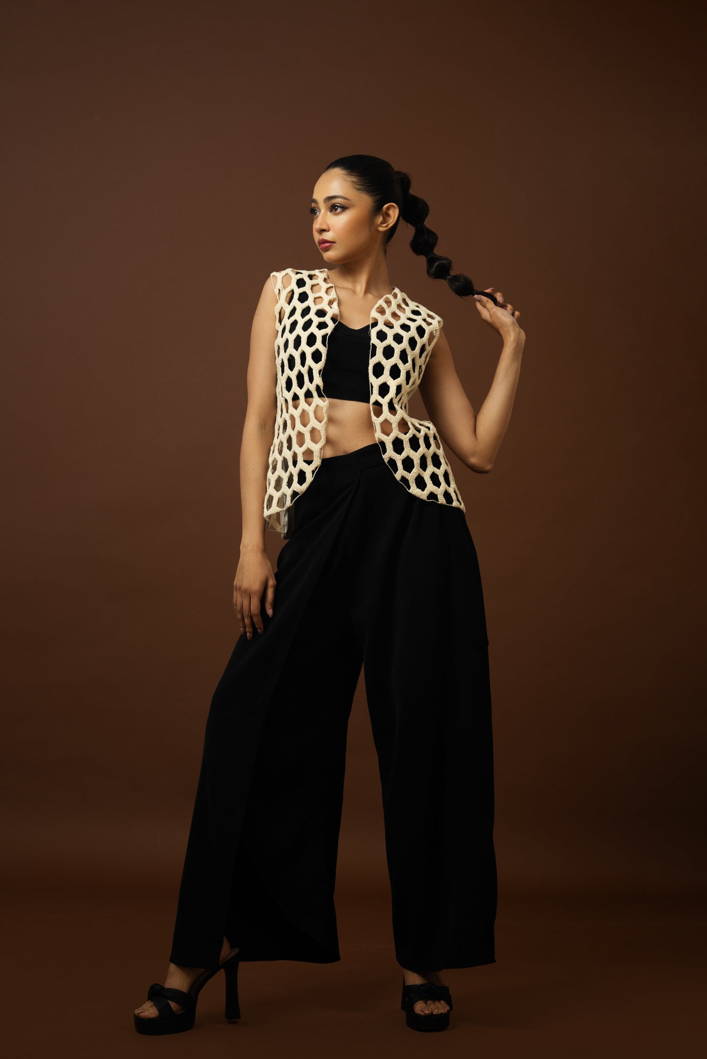 A co-ord set comprising a black top and slit pants, complemented by a white jacket adorned with a honeycomb pattern.