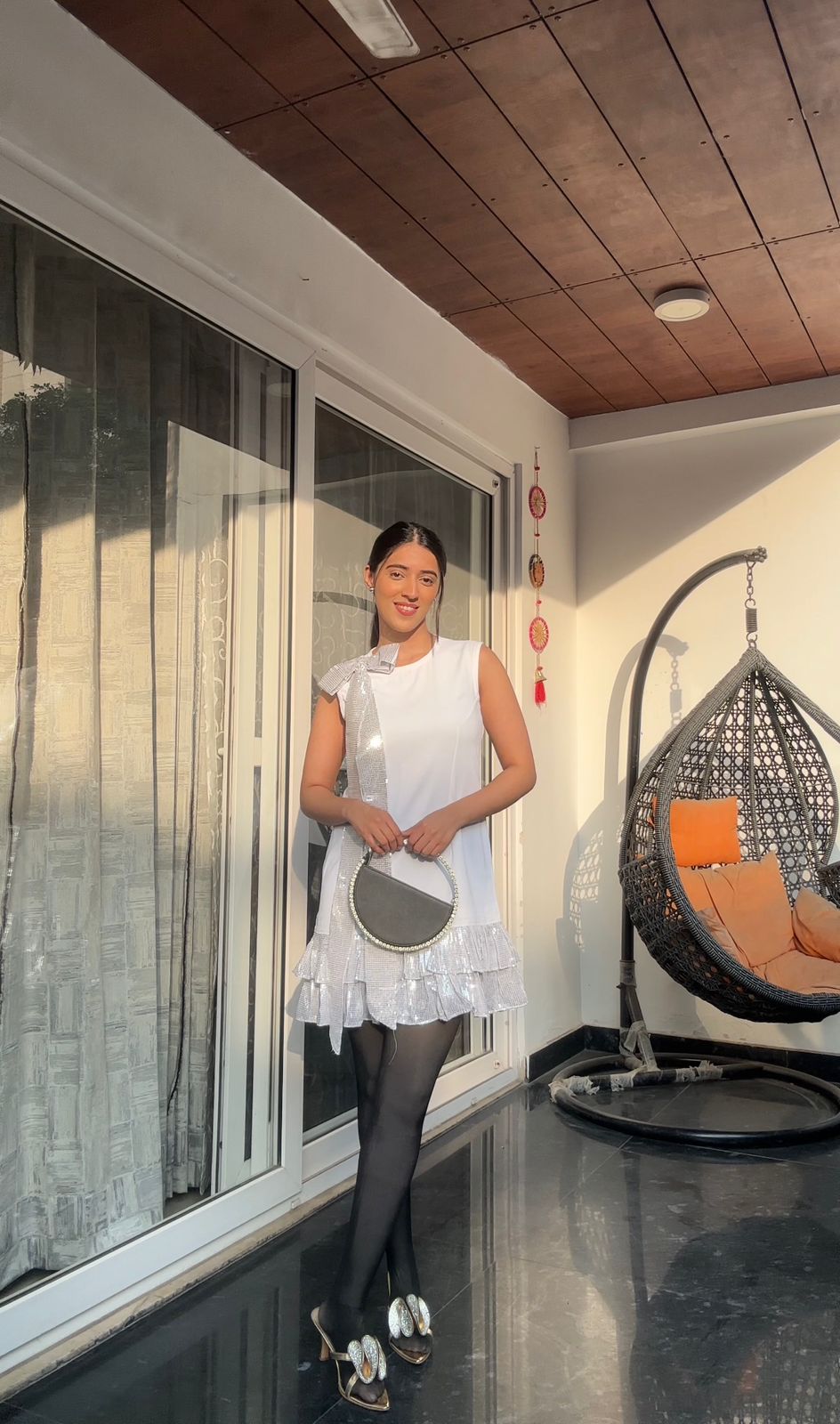 Crepe base dress with highlights of sequin frills & bow perfect for a brunch / starry night out.