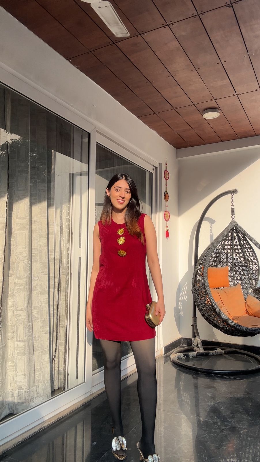 Maroon velvet dress with gold accents keeping the festivities & holiday vibe on throughout the year.